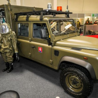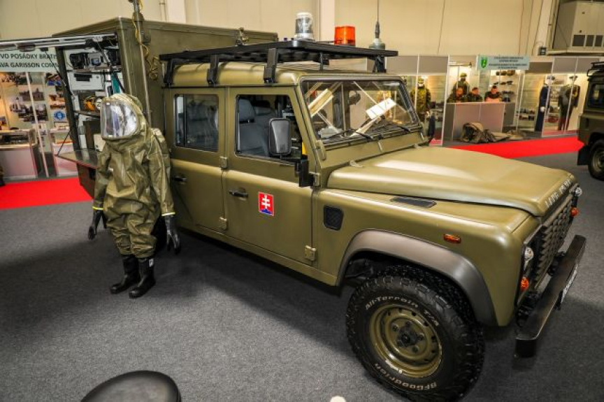 Špeciálne dekontaminačné vozidlo DEKVOZ a mobilné odberové vozidlo centra mobilných laboratórií Land Rover prezentovali príslušníci 103.prrchbo: poručík Patrik Nunhart, desiatnik Ladislav Bubenčík, desiatnik Roman Bubenčík a desiatnik Ladislav Orosz.