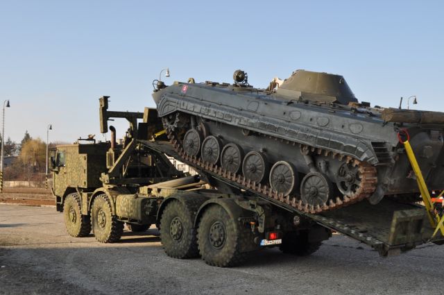 Na záver zamestnania bola vykonaná ukážka nakladania a upevňovania bojovej techniky prostredníctvom TATRY 815 MULTILIFT pomocou oceľovej rampy FLATRACK príslušníkmi dopravného práporu z Hlohovca.