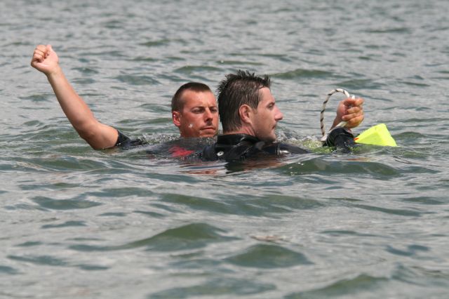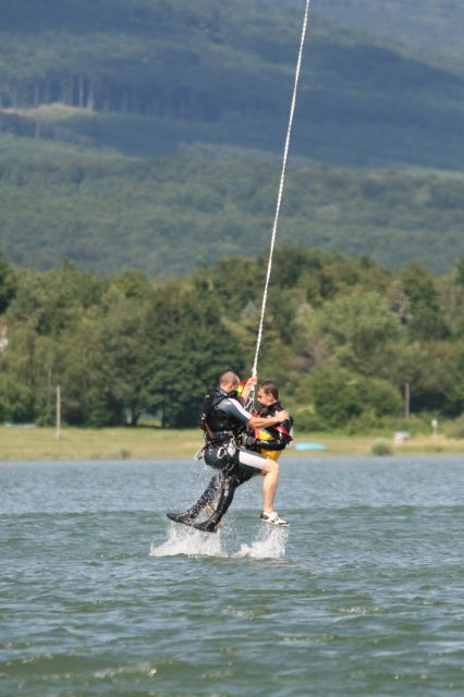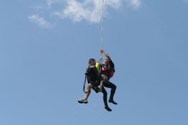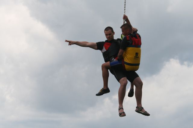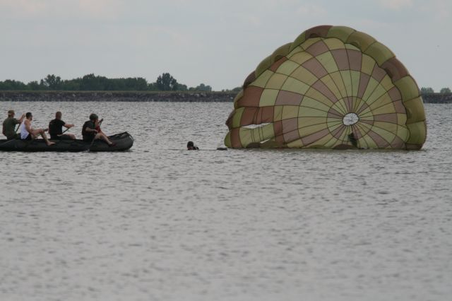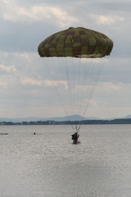 Záchranári si vyskúšali zoskoky z výšky 300 metrov na vodnú hladinu. Mnohí z nich majú v tejto oblasti veľké skúsenosti. Práporčík Kocík bol bývalým reprezentantom Slovenska v parašutizme a má na svojom konte vyše 4 100 zoskokov. Ešte viac ich má rotný Karol Adamčík. V tomto smere na Slovensku dokonca nemá v súčasnosti konkurenciu. Veď 11 800 zoskokmi sa nemôže nikto pochváliť. Záchranu z vodnej hladiny pomáhali na člnoch zabezpečovať vojenskej hasičskej jednotky pod vedením nadrotmajstra Daniela Cinkaniča.