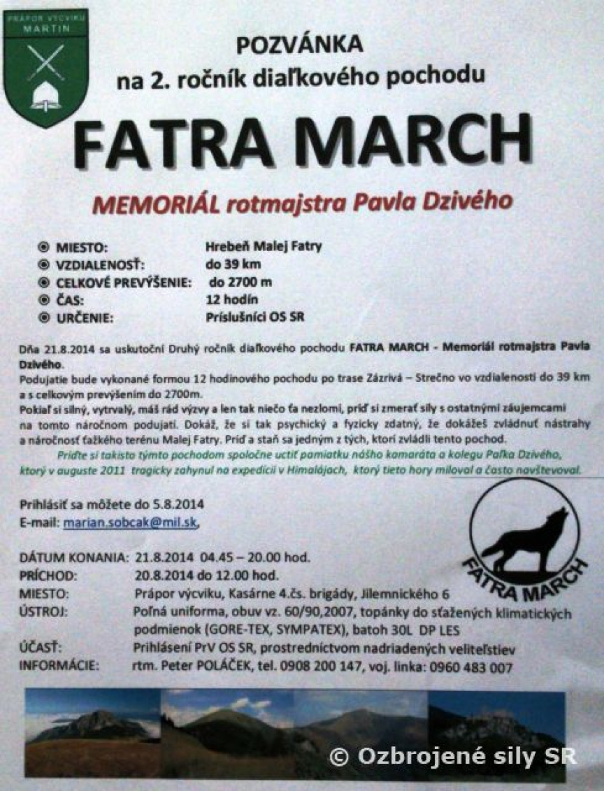 Diaľkový pochod FATRA MARCH – Memoriál rotmajstra Pavla DZIVÉHO je pochod po hrebeni Malej Fatry po trase Zázrivá - Strečno v celkovej vzdialenosti do 39 km, a celkovom prevýšení do 2700 m, v trvaní do 12 hodín. Podujatie si vyžaduje vysokú úroveň fyzických schopností, znalosť pohybu v náročnom horskom teréne, ako aj vysokú psychickú odolnosť. Toto podujatie je výborný spôsob na preverenie fyzických a psychických možností profesionálnych vojakov. Záujem zúčastniť sa na podujatí potvrďte zaslaním informácie na e-mail marian.sobcak@mil.sk do 31.07.2014. Následne vám budú zaslané propozície a prihláška.