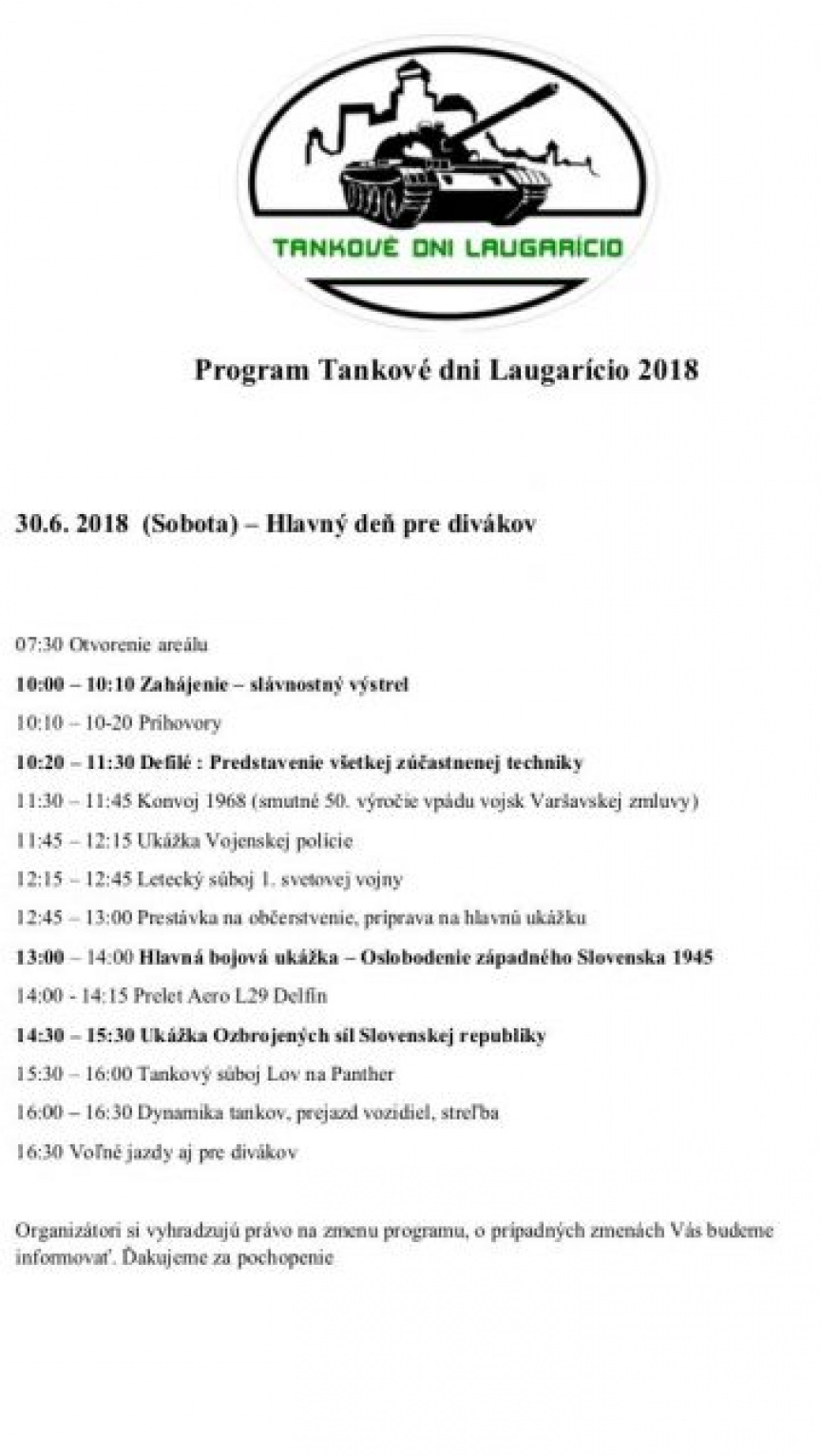 Srdečne Vás všetkých pozývame do Trenčianskych Stankoviec, kde sa dňa 30. júna 2018 uskutočnia Tankové dni Laugarício – Deň s pozemnými silami OS SR so začiatkom o 10,00 hod.