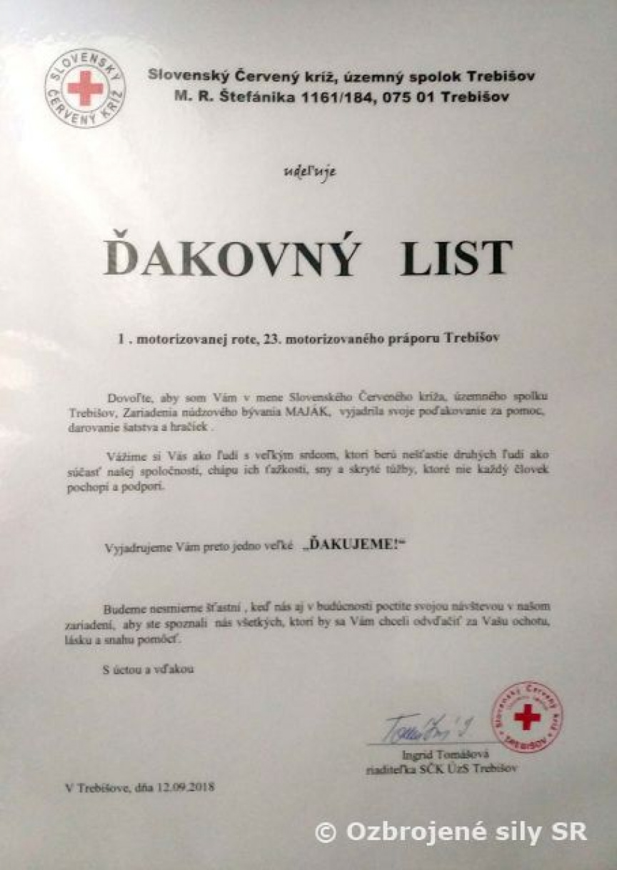 Všetci chceme žiť krásny, bezstarostný život, v ktorom sa nenachádza slovo „nedostatok“. Lenže svet okolo nás nie je vždy ideálny, preto sme sa my príslušníci 1. motorizovanej roty, 23. motorizovaného práporu Trebišov rozhodli pomôcť tým, ktorí pomoc skutočne potrebujú. Keď sme sa po prvý raz stretli s riaditeľkou Slovenského Červeného kríža územného spolku Trebišov pani Ingrid Tomášovou, ktorá na nás urobila svojim prístupom veľmi dobrý dojem, v tom momente sme boli rozhodnutí. V dnešnom svete sú peniaze tou najväčšou pomocou, ale pre ľudí v núdzi znamená slovko pomoc zďaleka niečo iné. Aj maličkosť, taká bežná vec – kvapka mora, ktorá sa môže v správnych rukách stať studňou na púšti. A tak sme u nás na rote urobili zbierku všetkého, čo nám už veľkú radosť doma nerobí, ale iní by ju veľmi radi prijali. Vyzbierali sme veľké množstvo šiat, kníh, hier a iných vecí, ktoré sme spoločne odovzdali na Červenom kríži v Trebišove. Boli sme veľmi prekvapení, lebo predstava o ľuďoch v núdzi je u nás Slovákov veľmi obmedzená a pri tom veľa úspešných ľudí bolo časom odkázaných na pomoc iných. Príbehy sú rôzne a spadnúť môže každý, kiež by sa to nikdy nestalo, ale ak áno, tak nech sa nájde niekto, kto podá ruku a pomôže vstať. Aj naďalej budeme pomáhať, nech verejnosť vie, že my vojaci sme tu pre nich.