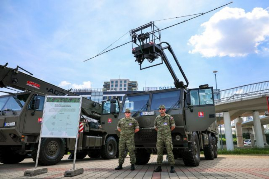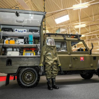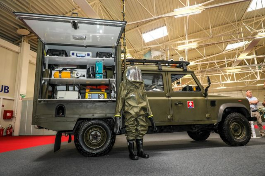 Špeciálne dekontaminačné vozidlo DEKVOZ a mobilné odberové vozidlo centra mobilných laboratórií Land Rover prezentovali príslušníci 103.prrchbo: poručík Patrik Nunhart, desiatnik Ladislav Bubenčík, desiatnik Roman Bubenčík a desiatnik Ladislav Orosz.