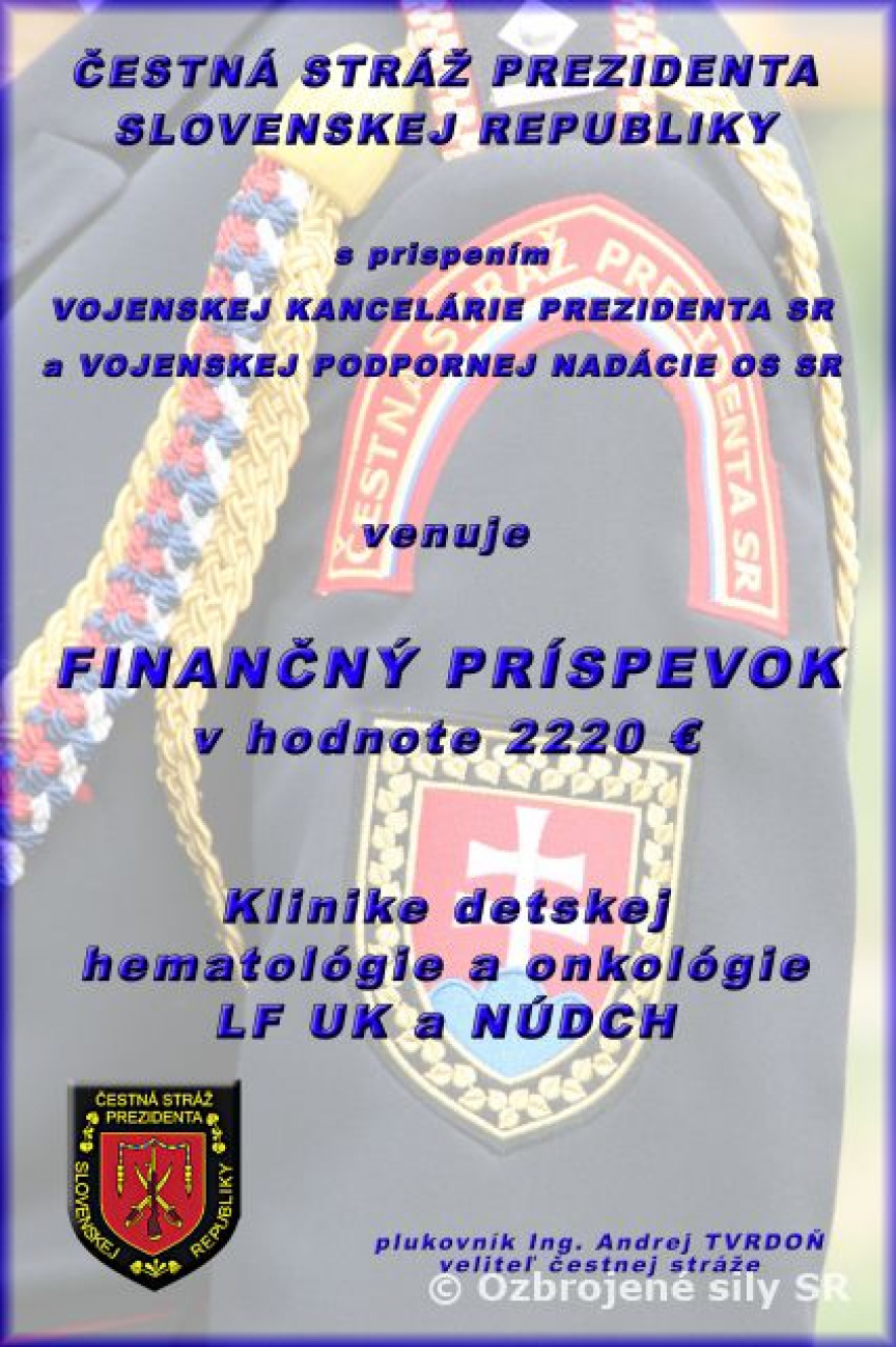 Vo štvrtok 9. júna navštívil veliteľ Čestnej stráže prezidenta Slovenskej republiky Detské onkologické oddelenie na bratislavských Kramároch, aby v mene útvaru odovzdal výťažok z dobrovoľnej finančnej zbierky a potešil deti, ktoré to najviac potrebujú.