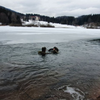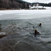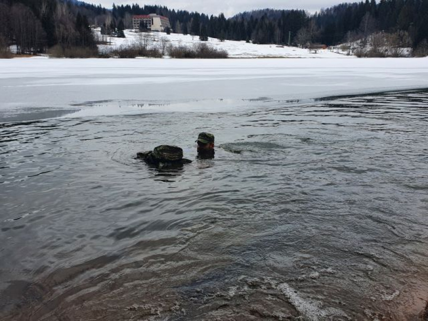 Činnosti si preverili najprv v príjemne teplej vode bazéna, ďalší deň sa však aj tento výcvik presunul do exteriéru. Vonku mrzlo a voda krpáčovskej vodnej nádrže mala len 3 °C. Väčšina hladiny bola pokrytá ľadom, len ústie miestneho potoka čeriaceho vodnú hladinu poskytlo priestor vhodný na bezpečný výcvik. Po inštruktáži do vody vstúpil najprv inštruktor vojensko-praktického plávania kapitán Michal Palkovič a po preverení podmienok aj samotní kadeti. Ako neskôr zhodnotili, najhoršie na tom bolo, že na sebe nemali plavky, ale bežné poľné oblečenie vojaka. Po prvotnom teplotnom šoku si vyskúšali plávanie na otvorenej vode, skryté plávanie, ale aj pomoc unavenému kolegovi. Na záver bolo treba ešte vyliezť na strmý a šmykľavý breh. Najviac dalo zabrať nekonečne dlhé vyzliekanie mokrého a na mrazivom vzduchu tuhnúceho výstroja.