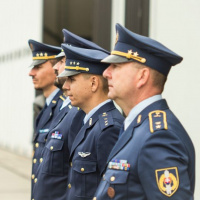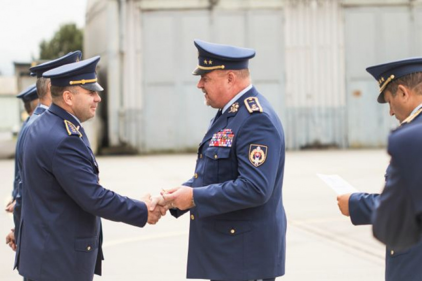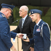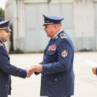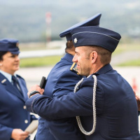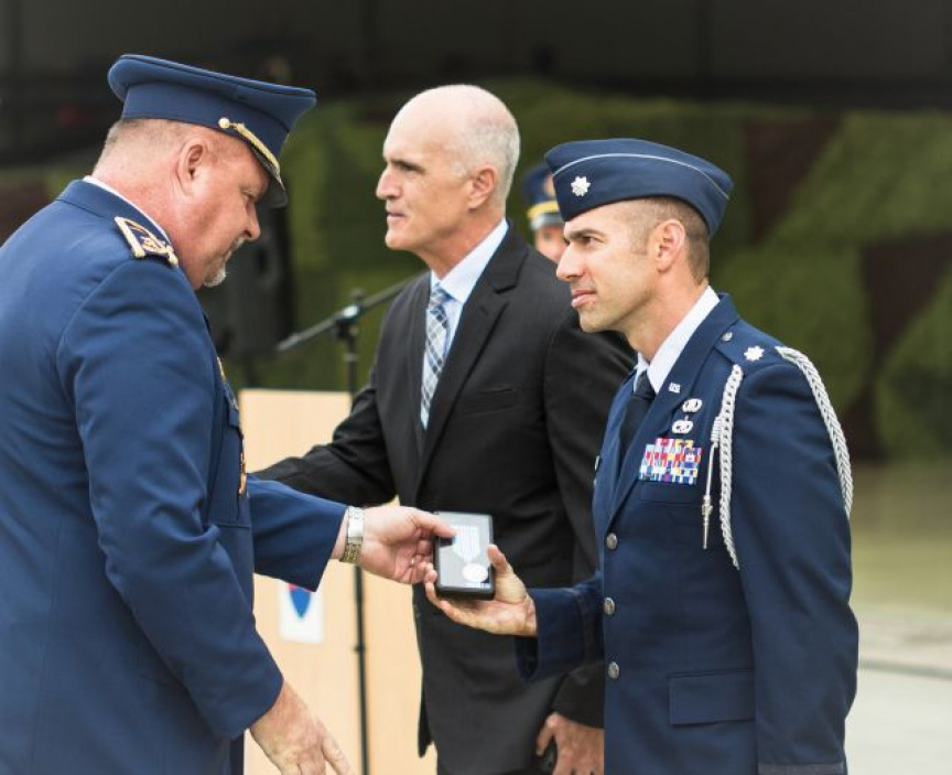 Veliteľ vzdušných síl odovzdal pamätné medaile aj odbornému poradcovi pre projekt F-16 Markovi Elymu z veľvyslanectva USA a leteckému pridelencovi obrany Spojených štátov amerických v Slovenskej republike podplukovníkovi Jonathanovi J. St. Peterovi.