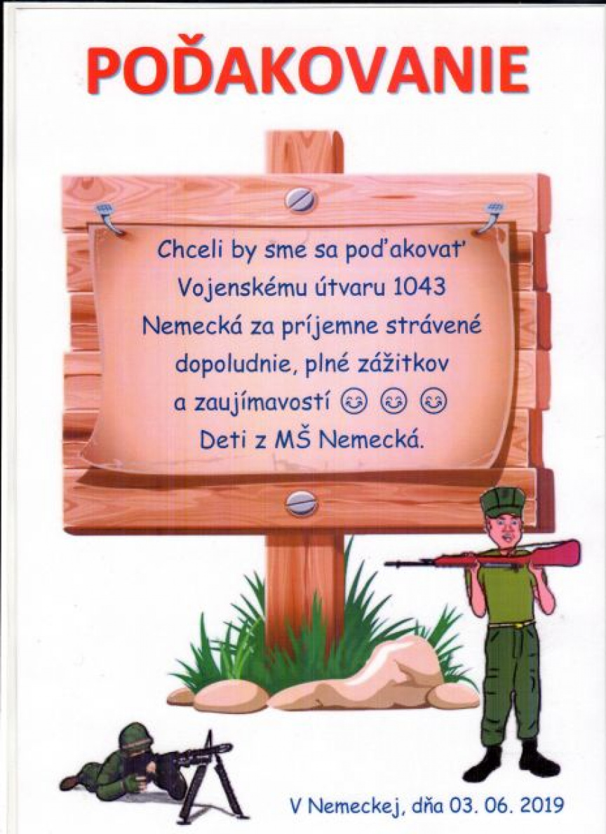 Pri príležitosti Medzinárodného dňa detí pripravili príslušníci ZNM Nemecká príjemné prekvapenie pre malé ratolesti. Dňa 03.06. 2019 pre najmenších pripravili statické ukážky vojenskej výzbroje, techniky a materiálu. V toto slnečné dopoludnie dobre padlo aj malé občerstvenie v podobe sladkých cukríkov, či pomarančového džúsu. Za toto všetko nás detičky odmenili krásnymi úsmevmi, iskrou v očiach, šťastným smiechom a jedným veľkým ĎAKUJEM.
