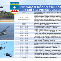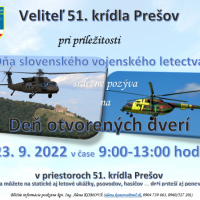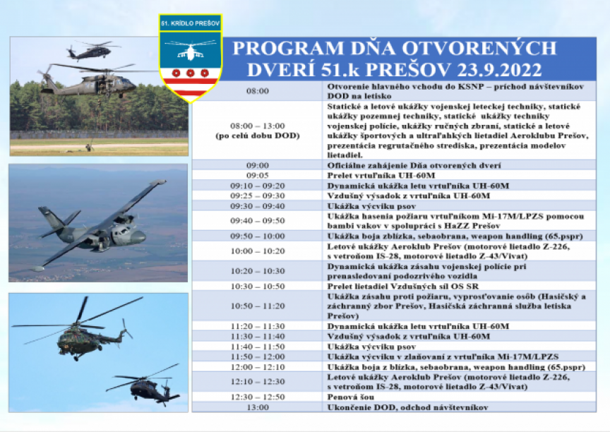 Deň otvorených dverí 51. krídla Prešov 12. September 2022 Brány 51. krídla budú otvorené pre návštevníkov od 08:00 hod. K preprave je možné využiť MHD č.1, alebo parkovacie odstavné plochy, na ktoré budete nasmerovaní pri príchode.