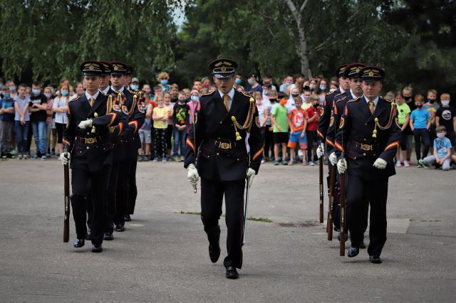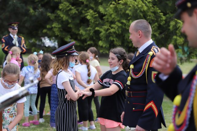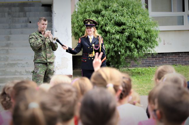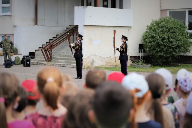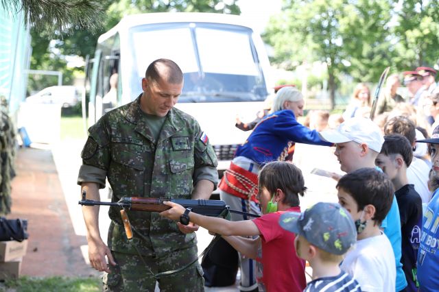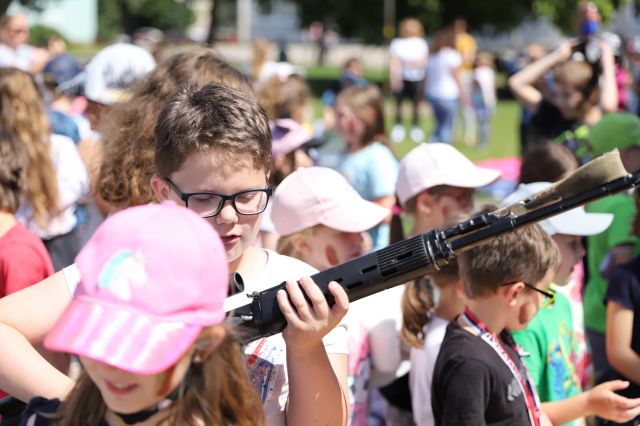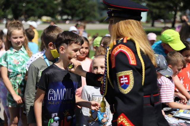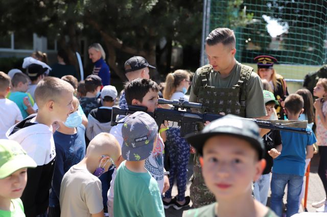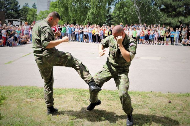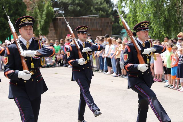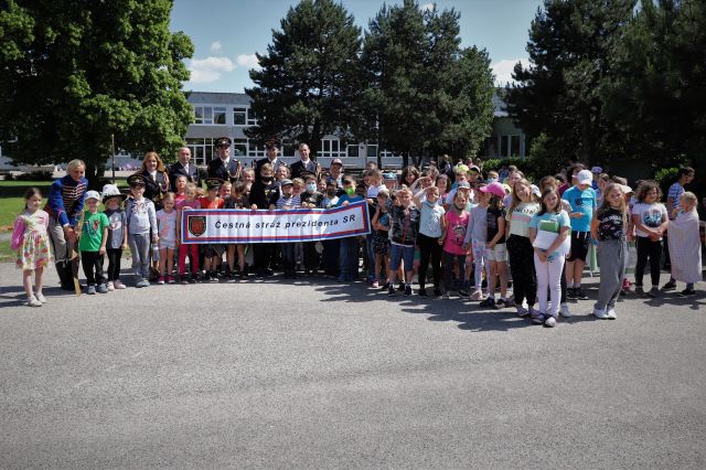 Dňa 14. júna sme si pripravili program pre deti zo Základnej školy Podzáhradná v Bratislave a Základnej školy Andreja Kubinu v Trnave. Obe školy navštevujú deti našich profesionálnych vojakov. Príslušníci Čestnej stráže prezidenta SR sa deťom predviedli so svojim programom. Premiéru galaprogramu mali aj dve naše príslušníčky slobodníčka Andrea Harčariková a slobodníčka Monika Kováčiková. V rámci ukážok sa deti zábavnou formou oboznámili s úlohami, ktoré ČS PSR plní. Predviedli sme im výstroj a výzbroj, ktorú používame pri reprezentácii a výcviku. Deti si vyskúšali pochodovanie pod velením čatára Mariána Simana a slobodníka Matúša Smetanku. Rotmajster Jozef Aľušík a desiatnik Peter Bacigál deťom predviedli ukážky zo sebeobrany. Deti si mohli chytiť do rúk guľomet, pušku a šabľu. V historickej uniforme sa im predviedla desiatnička Marta Jacková. Hudobník čatár Marek Turček deťom zahral niekoľko melódií so známych rozprávok a deti s nadšením hádali ich názvy, za čo dostali sladkú odmenu. Búrlivým potleskom, úsmevom na tvárach detí sme sa s nimi rozlúčili. Naša snaha spríjemniť deň našou prítomnosťou bola odmenená krásnymi obrázkami, ktoré nám poslali deti zo ZŠ Podzáhradná.