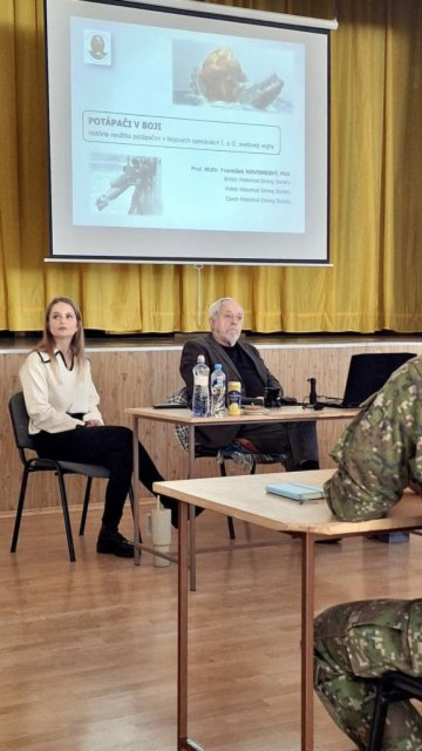 Pozvanie na konferenciu prijal hlavný prednášajúci prof. MUDr. František Novomeský, PhD., DAN Europe (Slovakia) Diving Medicine Officer, súdny znalec v špecializácii potápačská a hyperbarická medicína, autor vedecko-odborných kníh a desiatok vedeckých publikácií o medicíne potápania, súčasne člen Britskej spoločnosti historického potápania. Pán profesor má dlhoročné skúsenosti v problematike potápačskej medicíny aj zo sveta pod vodnou hladinou, ktoré ako aktívny potápač zbieral po desaťročia doma i v zahraničí. Ďalším prednášajúcim bola MUDr. Veronika Rybárová, PhD., DAN Europe (Slovakia) Diving Medical Officer, potápačská lekárka v Univerzitnej nemocnici Martin a aktívna potápačka. Obaja naši hostia sú súčasne súdnymi lekármi, ktorí majú možnosť vidieť aj odvrátenú stránku potápačského remesla. Na konferencii predniesli naši hostia innformácie o histórii bojových potápačov, o potápačských nehodách a osobitne o úmrtí potápača v areáli Čierna voda v roku 2021. Ako inak by takáto odborná konferencia mala začať, ak nie históriou potápačov v boji, ktorá je naozaj bohatá, presahujúca až do súčasnosti. Rovnako problematika nehôd pri potápaní je nám veľmi blízkou témou, pretože každý služobný potápač musí mať prioritný záujem na predchádzaní takýchto situácií, končiacich nezriedkavo až tragicky.