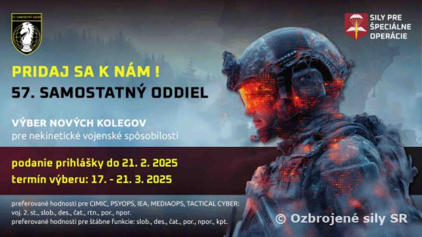 Ak ešte nie si profesionálny vojak a chceš slúžiť u nás, podaj si prihlášku do Ozbrojených síl SR s cieľom slúžiť v 57. samostatnom oddiele – v základnom výcviku Ťa oslovíme! à wwww.budemvojak.sk