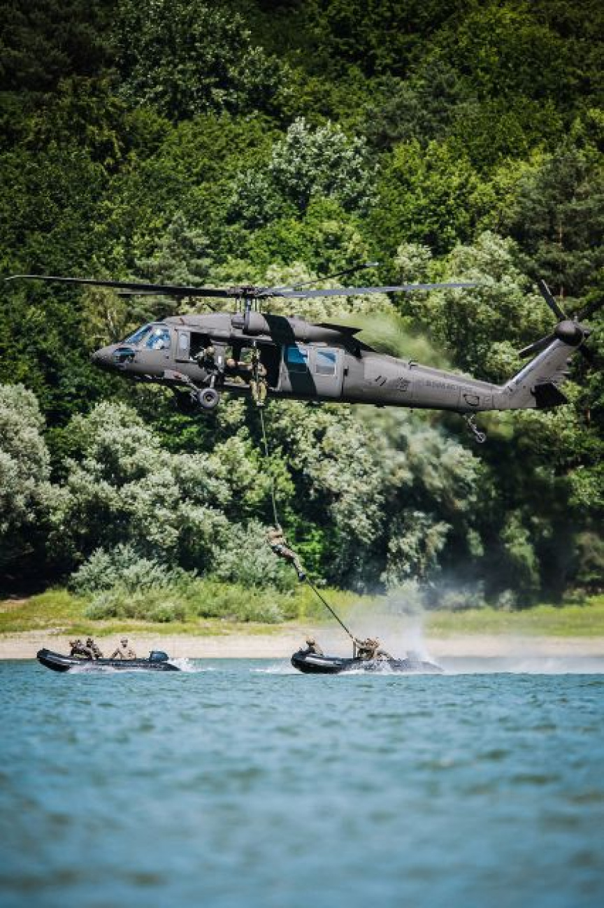 - vodnej plochy na východe SR, kde boli realizované scenáre so zasadením do idúceho člna Zodiac FC470 metódou FAST ROPE (FRIES – Fast Rope Insertion Extraction System), pričom bol počas - i po infiltrácii - úderný tím podporovaný priamou leteckou podporou vrtuľníkov Mi-17 a UH-60M z prešovského 51. krídla. Tie ničili ciele pod taktickým námetom na vodnej hladine i mimo nej,