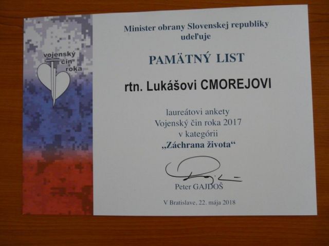 Laureátom ankety Vojenský čin roka 2017 v kategórii Záchrana života sa stal príslušník Práporu CSS Prešov rotný Lukáš CMOREJ, ktorý vykonáva funkciu vojenského zdravotníka. Ocenenie si prevzal z rúk ministra obrany SR.
