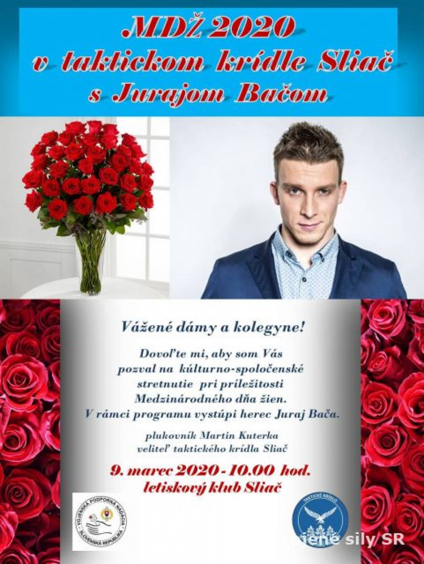 Deň významného sviatku všetkých žien sa blíži. Vďaka podpore Vojenskej podpornej nadácii sa dňa 9. marca 2020 pri tejto príležitosti uskutoční kultúrno-spoločenské podujatie v taktickom krídle Sliač, na ktoré sú pozvané profesionálne vojačky, zamestnankyne, spolupracovníčky z Letiska Sliač a primátorka mesta Sliač. Veliteľ taktického krídla Sliač plukovník Martin Kuterka zároveň blahoželá všetkým ženám k Medzinárodnému dňu žien a praje Vám, drahé dámy, veľa šťastia, zdravia a lásky a príjemné prežitie 8. marca 2020!