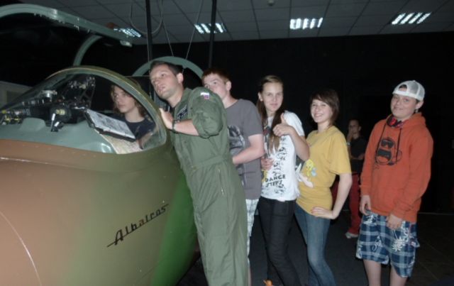 Nadšení študenti a učitelia pokračovali svojou návštevou v priestoroch trenažérového centra, kde mali možnosť absolvovať simulačný let na simulátoroch lietadiel L-39 a MiG-29. Technici nadpráporčík Branislav PERŽEL a podráporčík Miroslav BESKYD a piloti poručík Martin ŠIRKO a poručík Martin POKLEMBA oboznámili deti so základným ovládaním simulátora a potom už deti mohli absolvovať let. I napriek tomu, že návšteva trenažérového centra nebola hlavným dôvodom, prečo žiaci navštívili leteckú základňu, mala u mladých vedcov ohromný úspech.