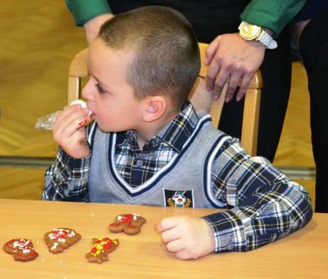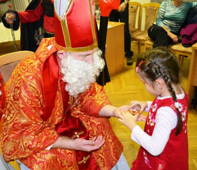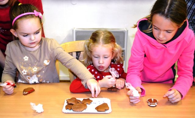 Keď naši najmenší vstúpili do klubu, zostali prekvapení. Stromček v rohu miestnosti nebol vianočný. Chýbali na ňom totiž vianočné ozdoby! A čo ak teraz Mikuláš nepríde, preblyslo nejednému mysľou. Ihneď sa preto pustili do práce a začali vyrábať vianočné ozdoby. A to nie hocijaké, ale sladké - perníkové! Práca im išla skutočne od ruky. Znenazdajky sa tu zjavil čert. Od ľaku niektorým takmer vypadli ozdôbky z ruky. Tí menší bežali za mamou a tlačili sa im na kolená. Len-len, že sa im od strachu neskotúľala po líčku slzička. V tej chvíli by odtiaľ najradšej bežali domov, ale túžba stretnúť sa s Mikulášom a dostať nejakú sladkosť zvíťazila.