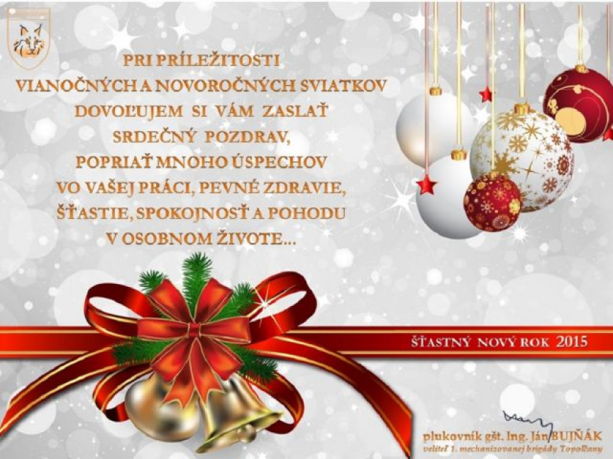 do nastávajúcich krásnych vianočných dní Vám želám, aby boli naplnené spolupatričnosťou človeka k človeku. Prajem Vám vnútornú silu, stály zmysel pre radosť z malých i veľkých vecí života, veľa zdravia, životnej iskry, lásky a vzájomnej úcty. Nech nový rok 2015 prinesie šťastie a naplnenie nádejí všetkým nám i celým ozbrojeným silám SR.