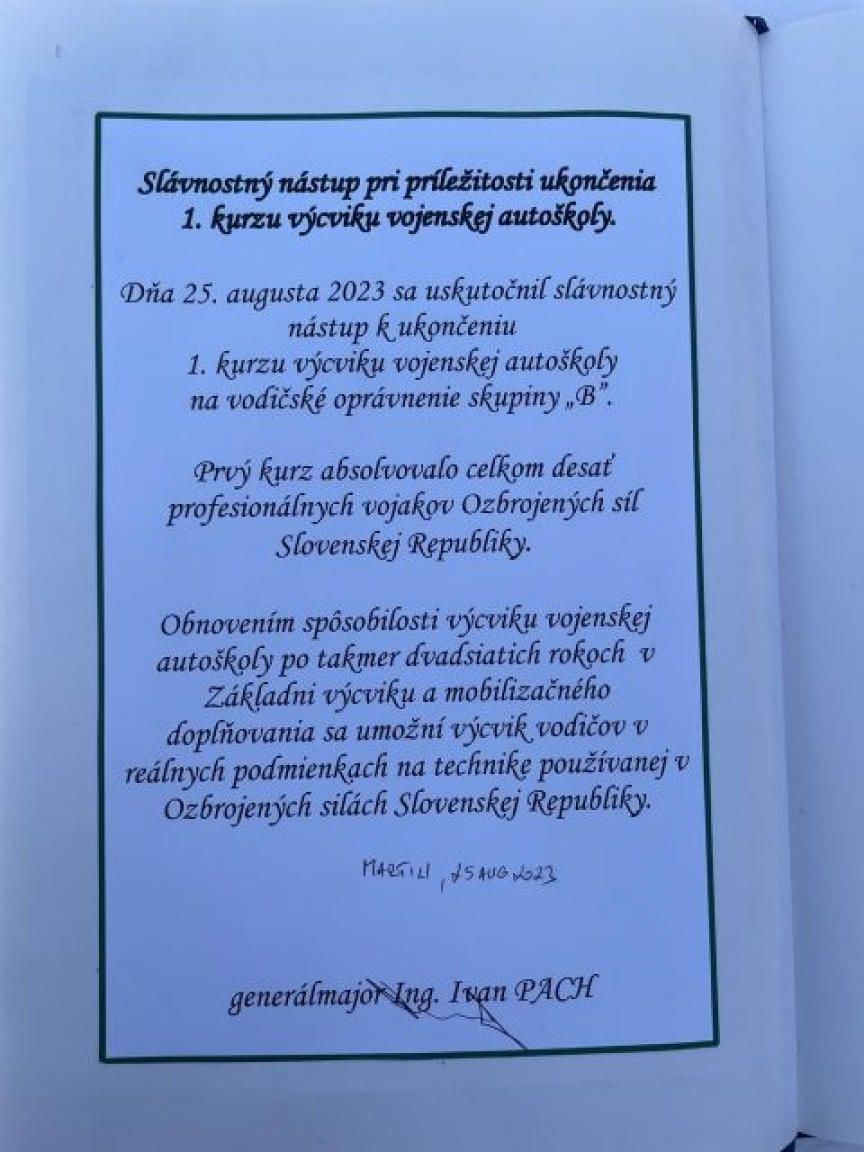 Dňa 25. augusta sa v priestoroch Základne výcviku a mobilizačného doplňovania Martin (ďalej len „ZaVaMD“) uskutočnil slávnostný nástup k ukončeniu 1. kurzu výcviku vojenskej autoškoly na vodičské oprávnenie skupiny „B“. Prvý kurz absolvovalo celkovo desať profesionálnych vojakov, pričom všetci získali vodičské oprávnenie skupiny „B“. Na slávnostnom ceremoniály sa zúčastnil veliteľ Pozemných síl generálmajor Ivan Pach, ktorý vo svojich slovách vyjadril veľkú spokojnosť, že sa takmer po dvadsiatich rokoch podarilo obnoviť spôsobilosť výcviku vojenskej autoškoly, ktorá je prospešná ako pre vojakov tak aj pre ozbrojené sily. Počas slávnostného nástupu veliteľ Pozemných síl uviedol, že počtom je akcia malá, ale významovo veľká a pre vojakov prináša určitý benefit.