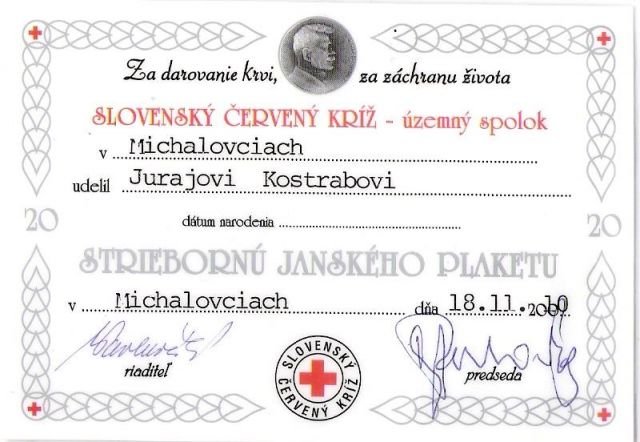 Vo štvrtok 18. novembra o 14,30 hod. boli v reštaurácii Dúha ( Domov Mládeže SOU-služieb) slávnostne odovzdávané ocenenia plakety prof. MUDr. Jana JÁNSKEHO bezpríspevkovým darcom krvi z okresu Michalovce.