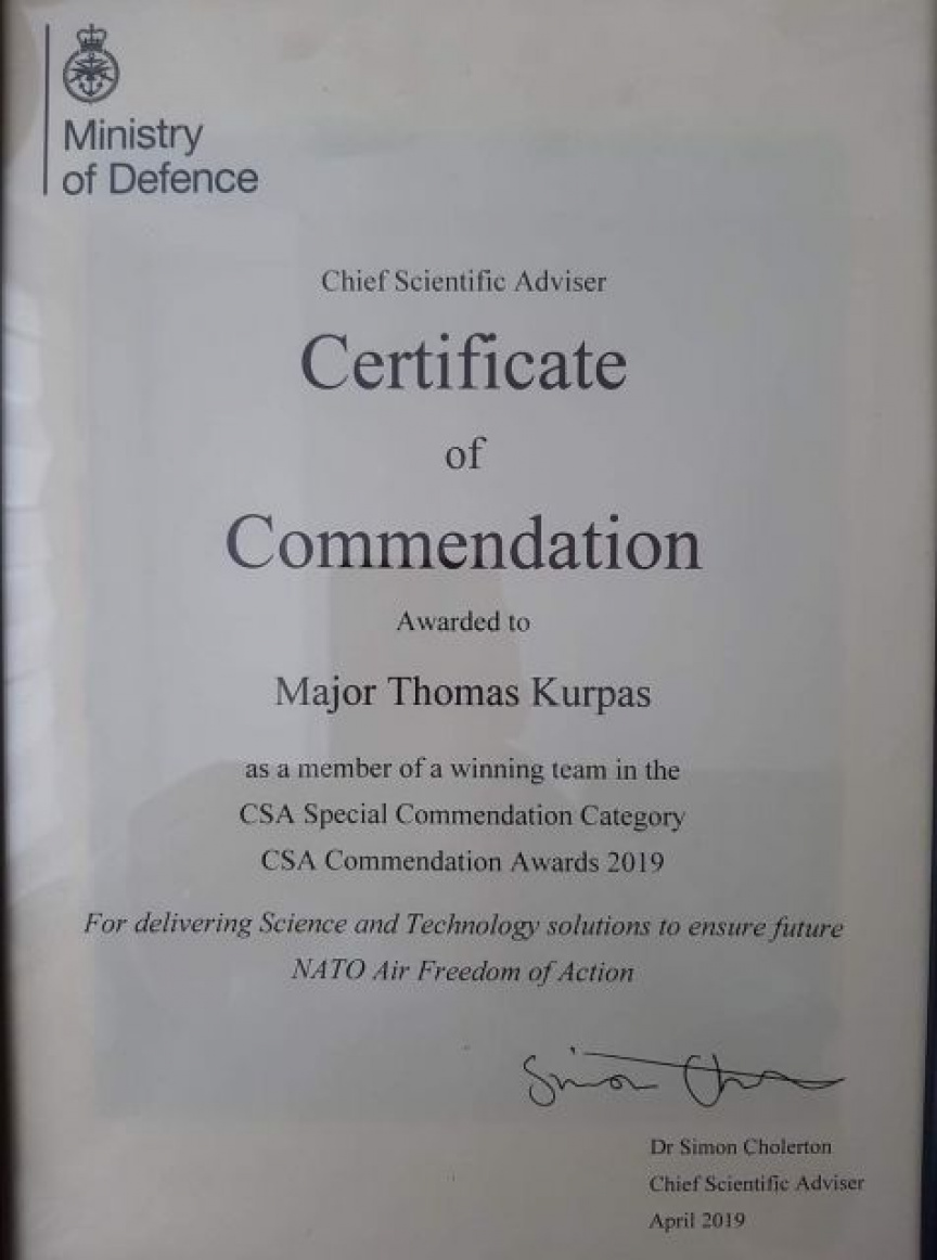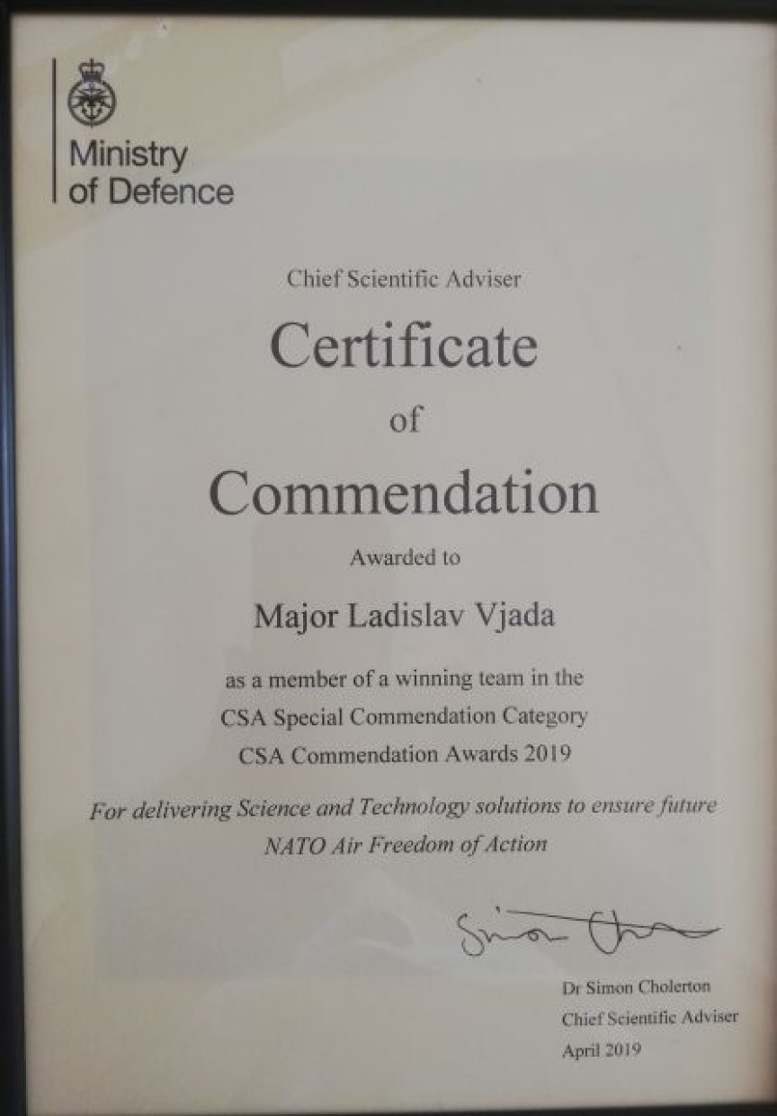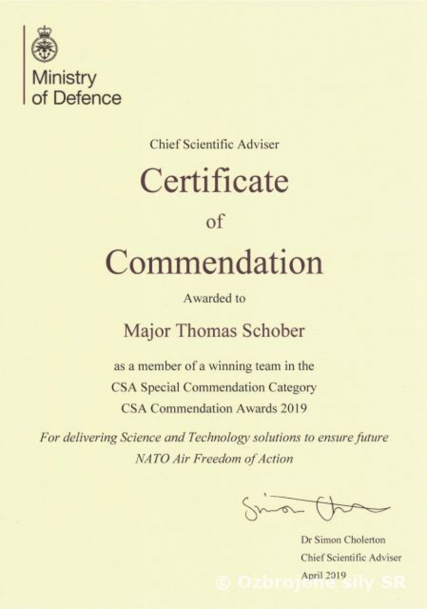 Svojim profesionálnym prístupom prispeli mjr. Tomáš Schóber, mjr. Tomáš Kurpaš a mjr. Ladislav Vajda k tomu, že závery cvičenia MACE XIX boli vyhodnotené ministerstvom obrany Spojeného kráľovstva Veľkej Británie a Severného írska ako významný prínos v oblasti vedy a technológií pre NATO.