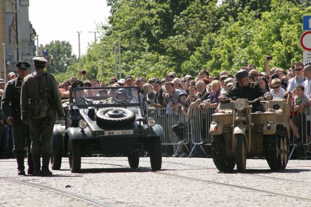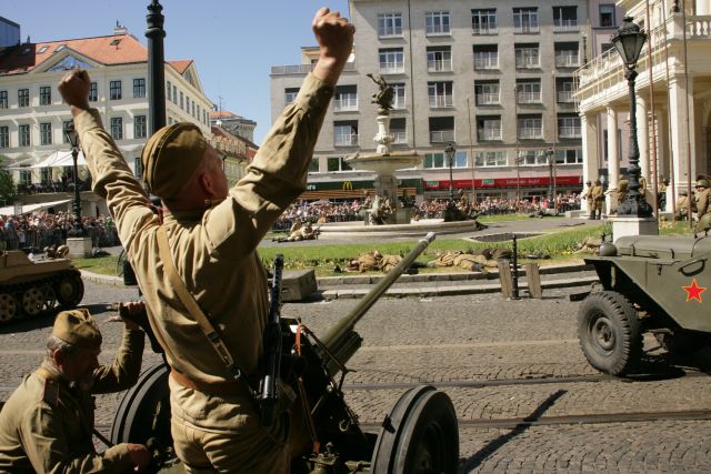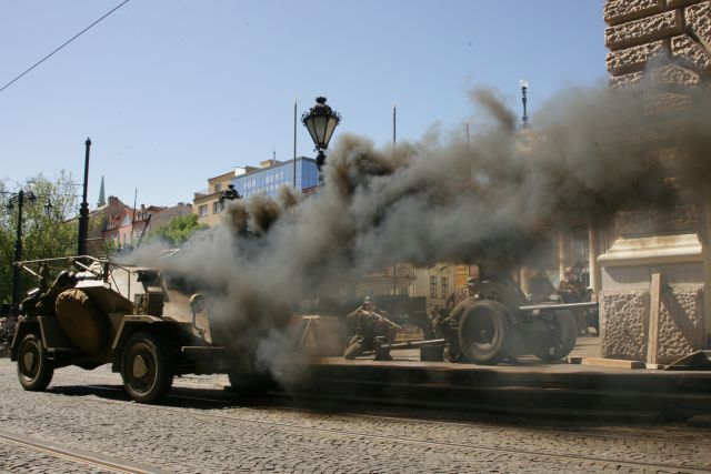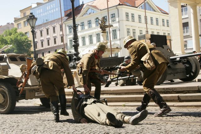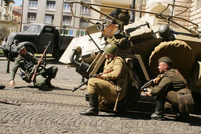 Výstrely z diel, dávky zo samopalov a guľometov i rachot motorov obrnenej techniky – to všetko bolo súčasťou ukážok bojov o oslobodenie Bratislavy. V utorok 8. mája, v centre hlavného mesta proti sebe „bojovali“ štyri desiatky mužov a žien v uniformách Wehrmachtu a približne 60 vojakov predstavujúcich jednotky Červenej armády.