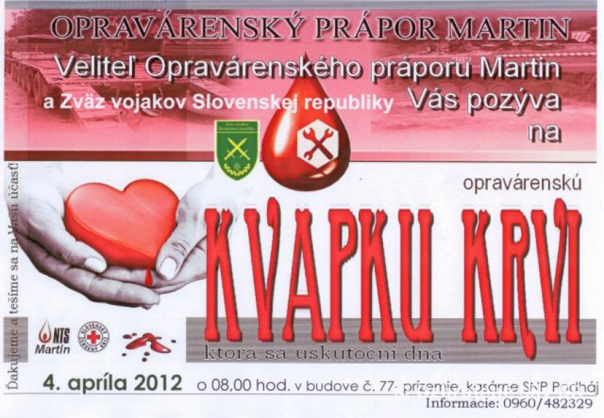 Dňa 4. apríla organizuje veliteľ Opravárenského práporu podplukovník Daniel Ličko v spolupráci so Zväzom vojakov Slovenskej republiky Opravárenskú kvapku krvi. Prápor tak pokračuje v tradícii, ktorá začala minulý rok v období Veľkonočných sviatkov, kedy sa akcie zúčastnilo 48 profesionálnych vojakov z Opravárenského práporu.