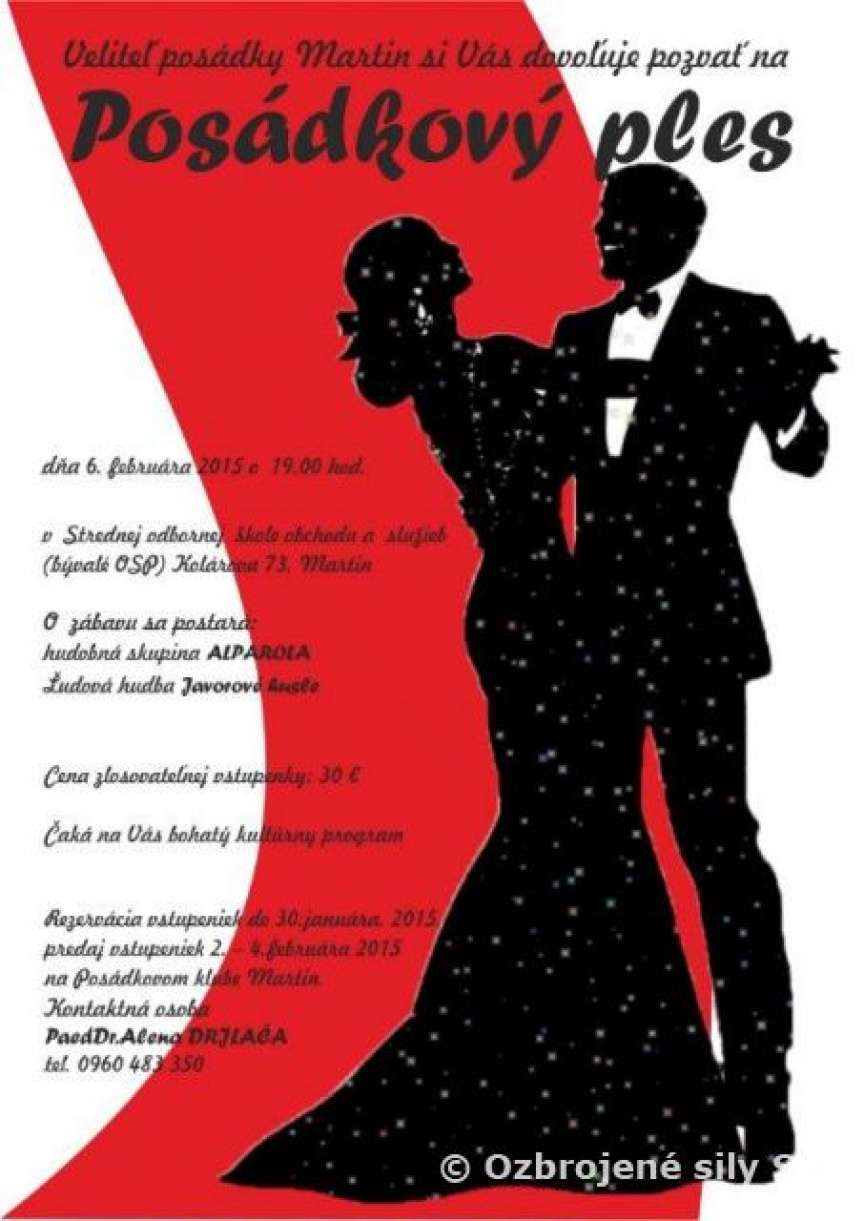 dovoľte, aby som sa Vás v mojom mene a v mene veliteľov útvarov posádky Martin, čo najsrdečnejšie pozval na posádkový ples, ktorý sa uskutoční 6. februára 2015 o 19,00 hod. v Strednej odbornej škole obchodu a služieb Martin.