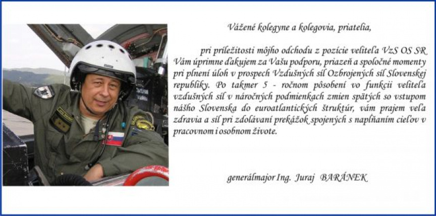 Z dôvodu plnenia nových povinností v prospech Ozbrojených síl SR je dňom 25. mája 2010 odvolaný z funkcie veliteľa Vzdušných síl OS SR generálmajor Ing. Juraj BARÁNEK.
