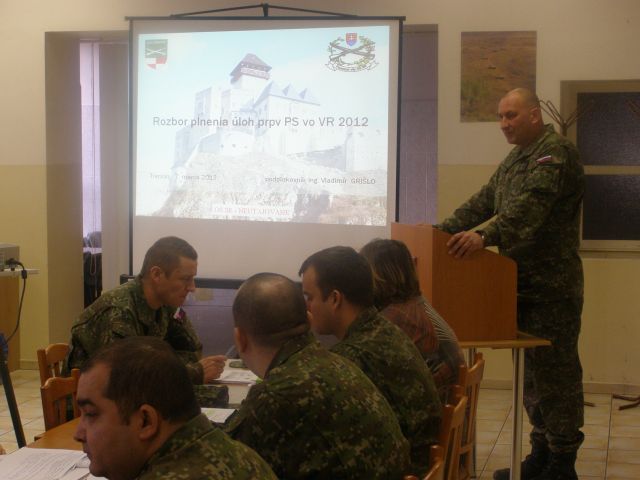 V prvej spoločnej časti veliteľského zhromaždenia veliteľ práporu podplukovník Vladimír Grišlo vyhodnotil splnenie hlavných úloh vo výcvikovom roku 2012 a objasnil zámer plnenia úloh vo výcvikovom roku 2013. Na zhromaždení vystúpil aj zástupca veliteľa Pozemných síl plukovník gšt. Karol Navrátil, ktorý objasnil smer ďalšieho rozvoja Pozemných síl a na záver sa poďakoval všetkým príslušníkom práporu podpory velenia za množstvo kvalitne odvedenej práce v prospech Pozemných síl. Všetkým príslušníkom práporu poprial veľa pracovného elánu a entuziazmu v nadchádzajúcom období. Program zhromaždenia pokračoval vyhodnotením výcvikového roka 2012 v jednotlivých oblastiach pod vedením odborných náčelníkov jednotlivých skupín.