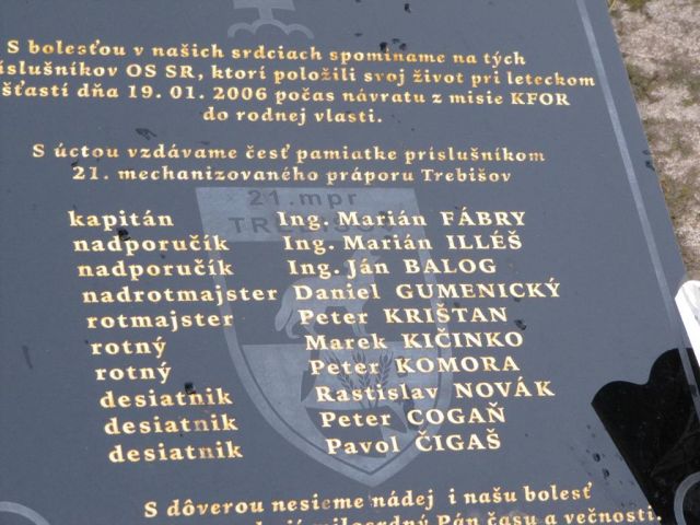 V pietnej spomienke na padlých desiatich profesionálnych vojakov sa dnes na čele so starším kaplánom práporu - npor. Mgr. Jánom SZAKALOM zišli príslušníci rôt, ale aj príslušníci veliteľstva a štábu práporu spolu so zastupujúcim veliteľom práporu - mjr. Ing. Mariánom MAKAYOM pri pamätníku venovanom ich spomienke. Dnes už len desať mien neznámym pripomenie ich existenciu a službu vlasti za ktorú položili svoje životy, ... no pre tých, čo ich poznali, sa za každým menom skrýva osud človeka, jeho jedinečnosť, ... slabé, ale aj silné stránky ich osobností, ... ich rodiny, .... a snáď aj mnoho práce ktorú zanechali počas pôsobenia v operácii v KOSOVE, či tu na Slovensku. Piate výročie a zvlášť ten osudný dátum - 19. január 2006 vo vedomí celého slovenského národa zanechal trvalú stratu a vedomie, aká drahá dokáže byť pomoc inému národu a čo sme ochotní urobiť pre zabezpečenie mieru, pokoja a bezpečnosti civilného obyvateľstva aj keď iného štátu. Česť pamiatke týmto profesionálnym vojakom - príslušníkom 21. mechanizovaného práporu Trebišov: kpt. Ing. Mariánovi FÁBRYMU, npor. Ing. Mariánovi ILLÉŠOVI, npor. Ing. Ján ovi BALOGOVI, nrtm. Danielovi GUMENICKÉMU, rtm. Petrovi KRIŠTANOVI, rtn. Marekovi KIČINKOVI, rtn. Petrovi KOMOROVI, des. Rastislavovi NOVÁKOVI, des. Petrovi COGAŇOVI, des. Pavlovi ČIGAŠOVI. Všetci títo a ďalší 32 príslušníci OS SR zahynuli 19. januára 2006 na kopci BORSÓ pri obci HEJCE.