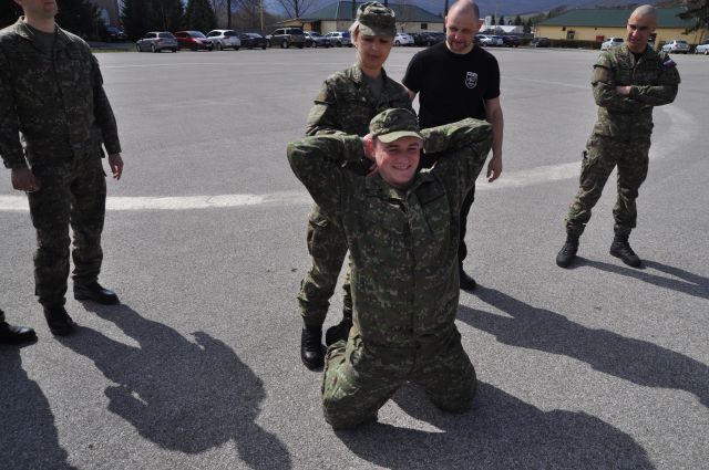 V praktickej časti sa profesionálni vojaci oboznámili so spôsobmi spútavania, prehľadávania a zadržiavania osôb. Ďalej s použitím donucovacích prostriedkov pri neuposlúchnutí výzvy, t. j. použitím páky na vytiahnutie osoby z vozidla a eskortovanie osoby. Taktiež sa venovali kontrole vozidiel a batožinového priestoru v súvislosti s možným výskytom nástražných a výbušných systémov, zbraní a streliva, alebo nebezpečných látok. Na záver si vojaci mohli na vlastnej koži vyskúšať prebrané techniky spútavania osoby v rôznych polohách: v stoji, v kľaku aj v ľahu.