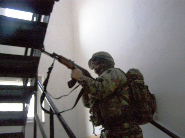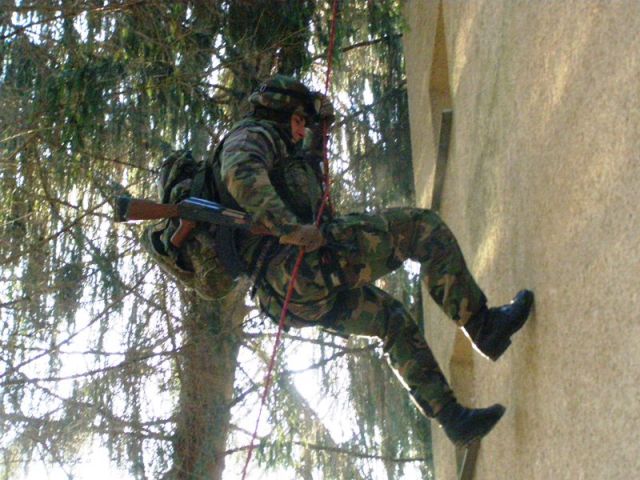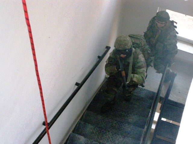 Preskúšanie základných bojových zručností pokračovalo nasledujúci deň v priestore PC Sučany. Taktickú prípravenosť a manipuláciu so zbraňou vojaci preukazovali v zastavanom priestore, kde sa okrem nepriateľa skrývali aj rukojemnícke ciele. Následný únik z budovy prebiehal zlaňovacími technikami.