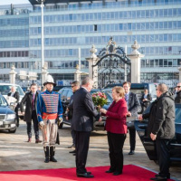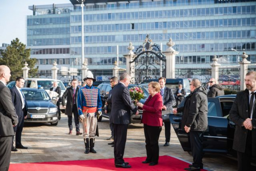 Príslušníci Čestnej stráže prezidenta SR zabezpečili prijatie nemeckej kancelárky malým špalierom a odovzdaním štátneho vy znamenia pod velením kpt. Ing. Tomáša Meda.