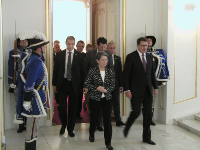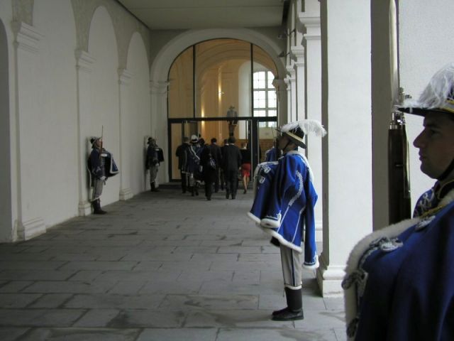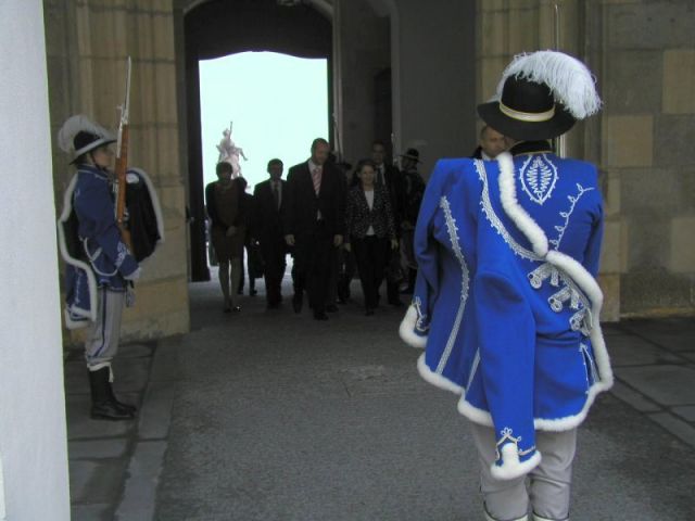Špalier jednotky Čestnej stráže OS SR v historických rovnošatách privítal na oficiálnej návšteve Slovenskej republiky predsedníčku Národnej rady Rakúskej republiky J.E. Barbaru Prammerovú v priestoroch Bratislavského hradu.