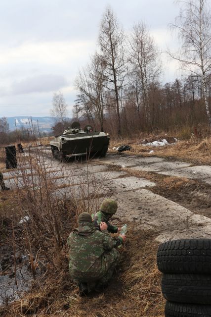 Veľmi zaujímavé bolo pracovisko, ktoré viedol inštruktor výcviku rotmajster Henrich Vargončík. Simulovalo boj s obrnenými prostriedkami protivníka. Celý fígeľ je v tom, že vojak sa musí nepozorovane dostať z priestoru, zaujať miesto pred bojovým vozidlom, prekotúľať sa pod vozidlo, po prejdení vozidla nad ním musí dokázať hodiť zápalnú fľašu či granát na vozidlo a znova sa čo najrýchlejšie dostať do krytu. „Pred zamestnaním sme mali teoretickú prípravu. Vojakom som všetko vysvetlil, názorne ukázal. Chápem, že je to náročné zamestnanie najmä na psychiku, ale všetci ho úspešne zvládli. Tým ktorí mali predsa len určité obavy som to znova názorne ukázal. Dokonca s niektorými som išiel spoločne pod vozidlo,“ približuje inštruktor plnenie úlohy.