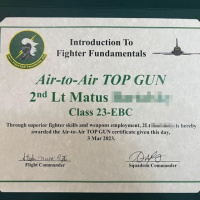 Aktuálne sa ziskom ocenenia môže pochváliť aj nadporučík Matúš, ktorý dňa 14. marca 2023, úspešne ukončil výcvik na cvičnom prúdovom lietadle T-38 Talon v takzvanom IFF course (Introduction to fighting fundamentals) na leteckej základni Columbus štát Mississippi. Počas výciku sa mu podarilo získať prestížne ocenenie Air-to-Air TOP GUN a ocenenie River Rat warrior award čím predstihol aj svojich amerických kolegov. Nadporučík má na lietadle typu T-38 Talon nalietaných viac ako 120 hodín a v súčasnosti sa pripravuje na výcvik na lietadle F-16 na leteckej základni Morris Air National Guard v meste Tucson v štáte Arizona.