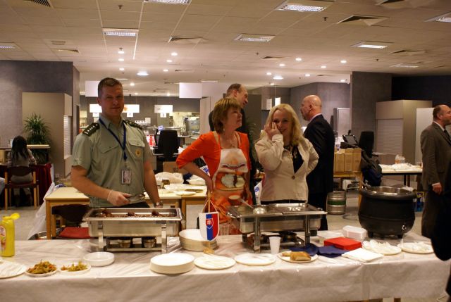 Každá krajina pripravila typické národné jedlá. My sme sa rozhodli pre pečené klobásky, jaterničky, guľáš z diviny a tradičné kapustové strapačky vrátane ďalších pochutín. Manželky profesionálnych vojakov sa postarali o prípravu väčšiny sladkých a slaných dobrôt. Prispievali taktiež svojim šarmom a krásou. Chuť a kvalita slovenského piva opäť oslovila všetkých zamestnancov NATO a EÚ. Nechýbala ani propagácia Slovenska vo forme videoprojekcie a propagačných materiálov.