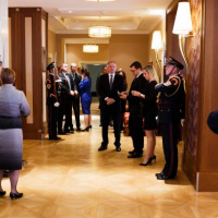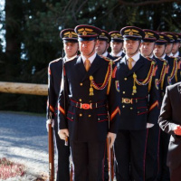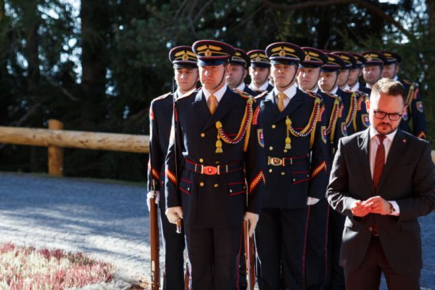 Príslušníci Čestnej stráže prezidenta SR privítali prezidentov V4 pri prílete na Popradskom letisku pod velením nrtm. Mgr. Martina Porubského.