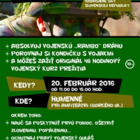 UKÁŽ NA ČO MÁŠ! - AVÍZO 16. Február 2016 Ministerstvo obrany SR a Ozbrojené sily SR si Vás dovoľujú pozvať dňa 20. februára 2016 od 11:00 do 15:00 hod. na podujatie "Ukáž na čo máš!", kde sa dozviete všetko o dobrovoľnej vojenskej príprave. Dátum a čas: 20.02.2016 o 11:00 hod, Miesto: Humenné, Pri amfiteátri (ulica Gorkého)