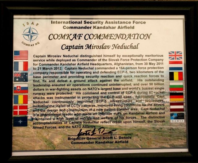 Veliteľ kandahárskej leteckej základne (KAF) brigádny generál Scott Dennis pozval 18. marca na veliteľstvo KAF veliteľa slovenskej strážnej roty kapitána Miroslava Nedúchala, aby mu pred jeho návratom do vlasti osobne venoval svoju pamätnú medailu a poďakoval sa skvelú činnosť jeho vojakov. Ocenil jeho vodcovské schopnosti a povedal: "Na Vaše vedenie a riadenie ochrany základne na vstupnom a výstupnom bode 5, a aj pri ostatných činnostiach, sme sa aj napriek raketovým útokom na KAF mohli vždy spoľahnúť. Boli ste v prvej línii a aj preto si Vašu prácu mimoriadne vážim. Spolu s Vašou jednotkou ste zvýšili kredit Slovenska v operácii ISAF aj v rámci NATO.“