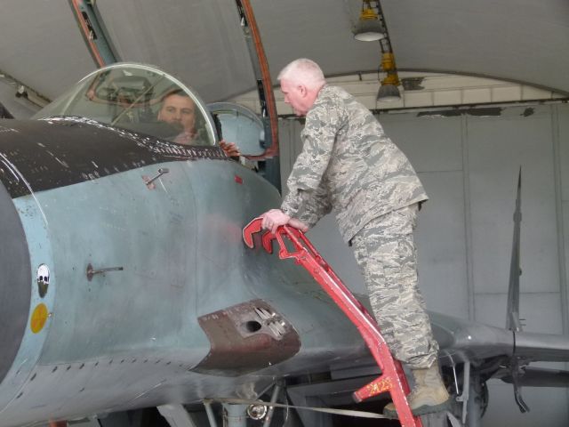 Delegáciu po prílete na pôde zmiešaného krídla privítal a ďalej sprevádzal zastupujúci veliteľ podplukovník Martin Hronec. Po úvodnej prezentácii o histórii, úlohách, poslaní a štruktúre leteckej základne nasledovala ukážka leteckých trenažérov MiG – 29 a L- 39 ako aj statická ukážka týchto lietadiel.