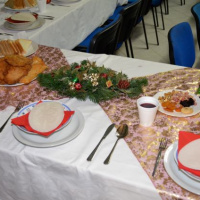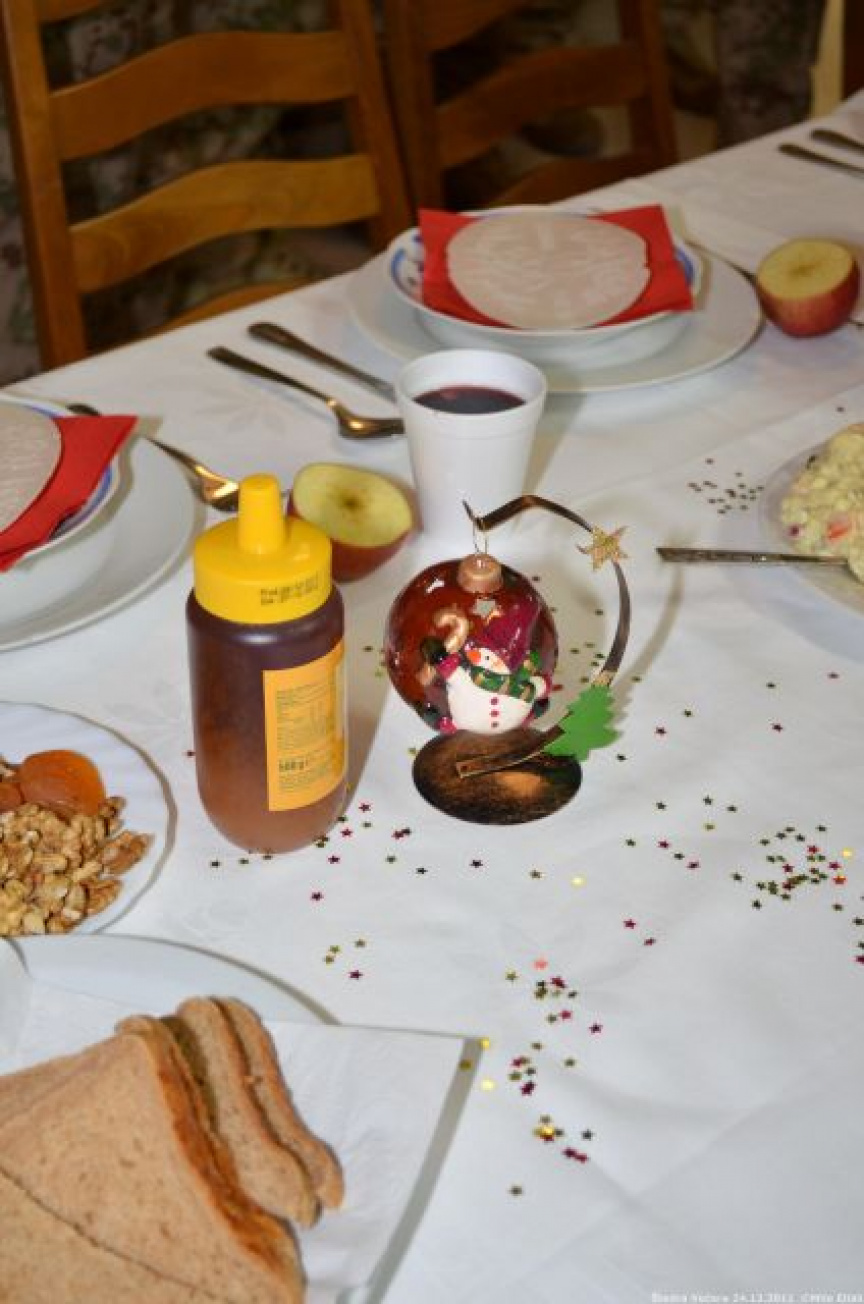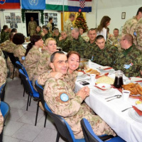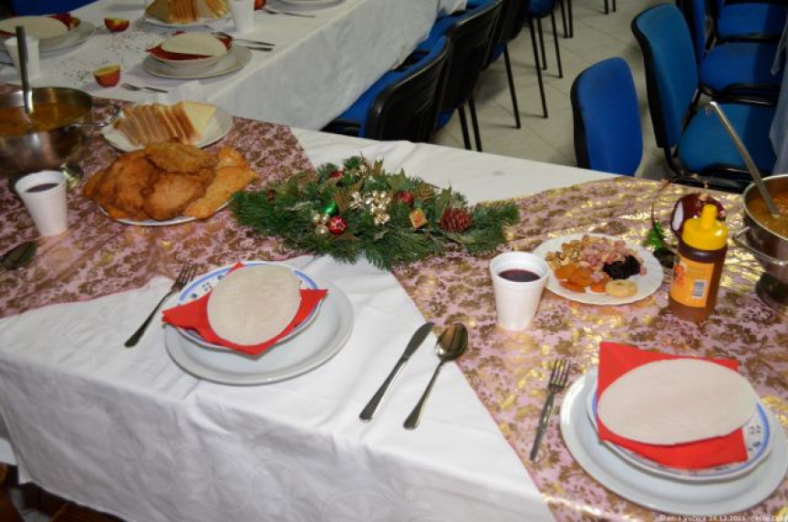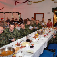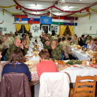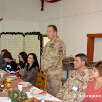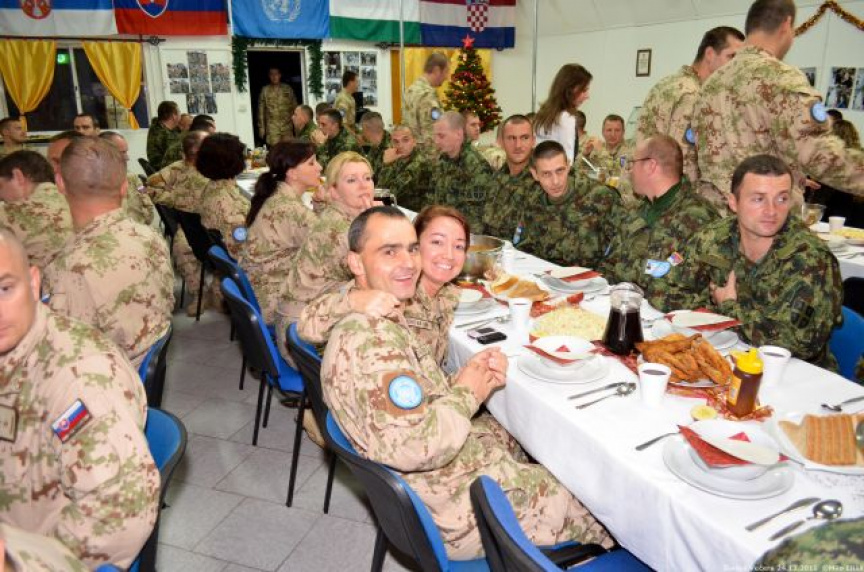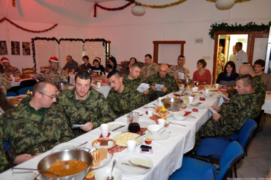 Už v ranných hodinách sa začala príprava štedrej večere, na ktorej sa s nadšením podieľali nielen slovenskí, ale aj chorvátski, maďarskí a srbskí príslušníci Sektoru 4, aby si nakoniec mohli pri spoločnom stole v pokoji vychutnať aspoň na malú chvíľu neopakovateľné čaro Vianoc. Počas slávnostnej večere, ktorej predchádzal príhovor veliteľa Sektoru 4 pplk. Jozefa PAŇKA a spoločná modlitba v jednotlivých národných jazykoch, nesmeli na slávnostnom stole chýbať tradičné oblátky, med a kúsok jabĺčka, ako symbol toho, že Sektor 4 tvorí každý jeden príslušník tak, ako jednotlivé kúsky tvoria celé jablko. Vďaka šikovným kuchárom sa štedrovečerný stôl stal skutočne štedrým pre všetkých, ktorým chuť a vôňa kapustnice s hríbami, klobásou a údeným mäsom ako aj vyprážaná ryba so zemiakovým šalátom pripomenula aspoň na krátky okamih domov.