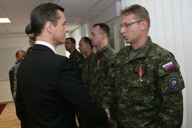 Štátny tajomník Miloš Koterec a náčelník generálneho štábu OS SR generálporučík Peter Vojtek následne po vyhlásení rozkazu ministra obrany Martina Glváča o udelení vojenských medailí a odznakov dekorovali v ministrovom mene vojakov vyznamenaniami za službu v operácii Európskej únie ALTHEA. Zároveň sa poďakovali rodinným príslušníkom za podporu ich blízkych, ktorí plnili vojenské úlohy v Bosne a Hercegovine.
