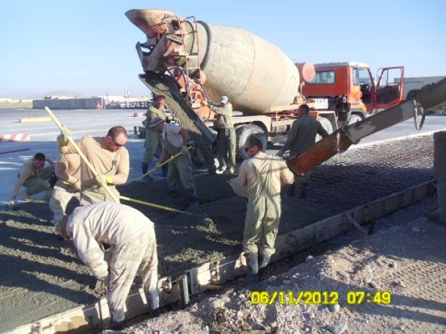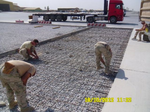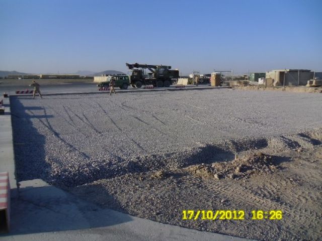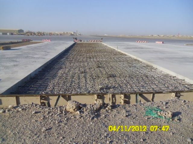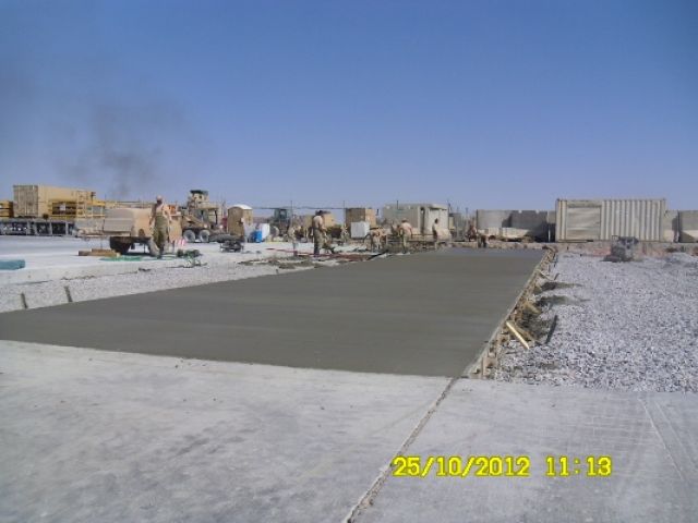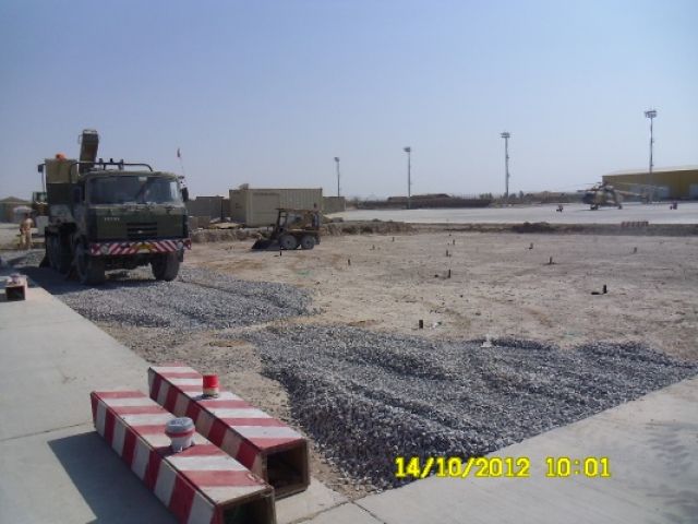 Práce na projekte prebiehali v dvoch fázach. V prvej fáze bolo potrebné zamerať sklon plochy a podľa požiadaviek správcu letiska „Air Base Kandahar“ správne vyspádovať podlažie a vykonať komplexné prípravy na betonárske práce. Druhá fáza spočívala vo vyhotovení debnenia a samotnej betonáži, ktorá prebiehala kontinuálne betónovaním jednotlivých pásov o šírke 5 metrov.