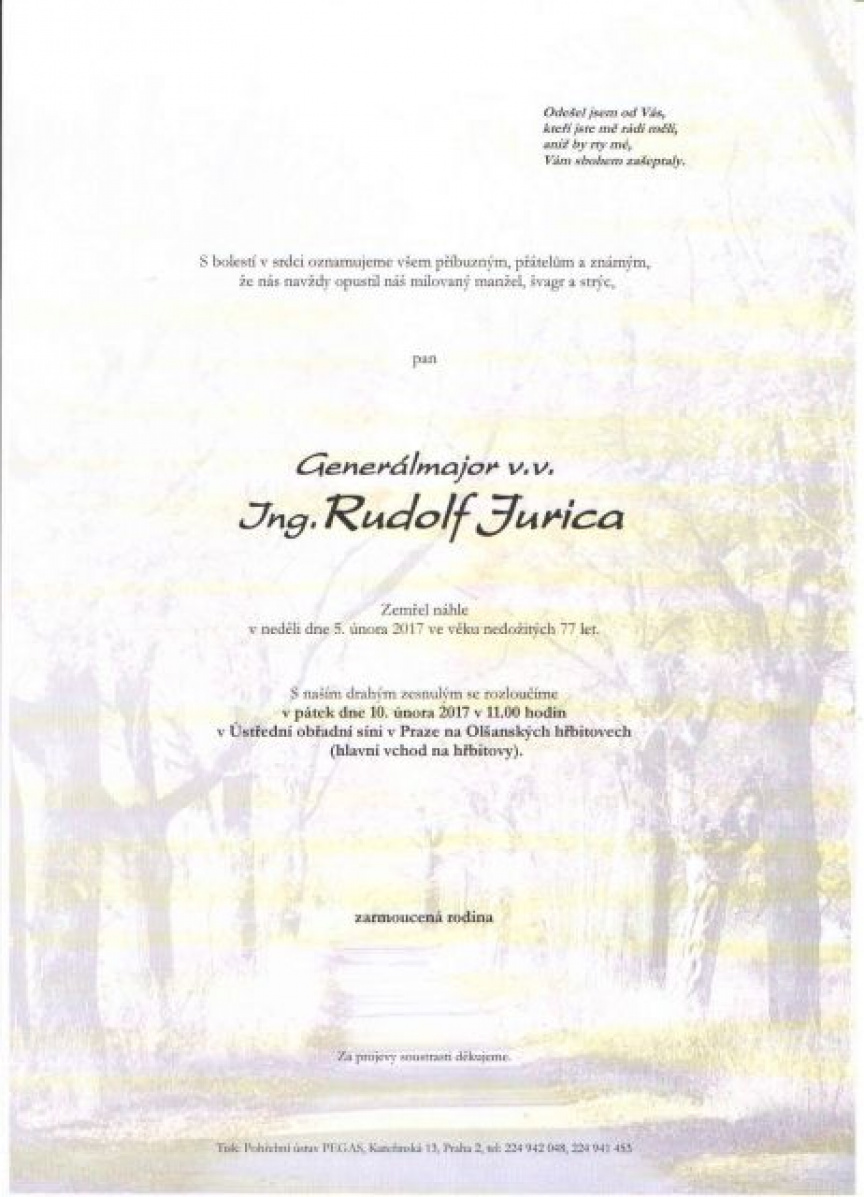 Dňa 5. februára vo veku 76 rokov zomrel bývalý veliteľ Veliteľstva posádky Bratislava generálmajor Ing. Rudolf Jurica.